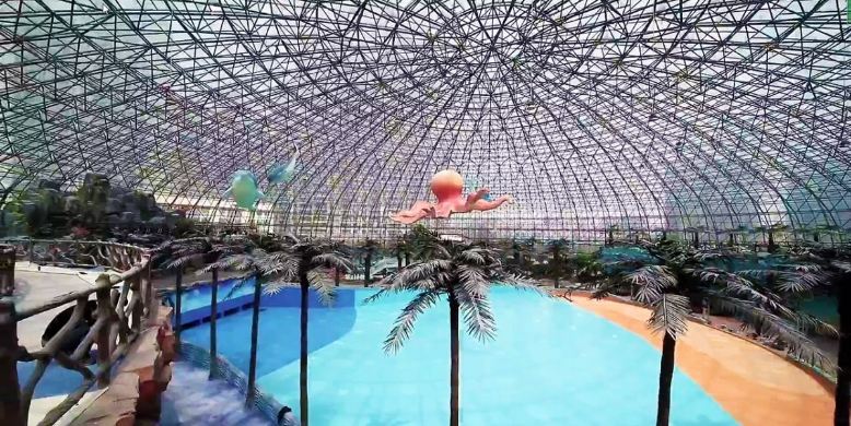 近年來,潛江市龍蝦產(chǎn)業(yè)蓬勃發(fā)展,兼具旅游購(gòu)物、商貿(mào)物流、餐飲文化、娛樂休閑等多種功能的中國(guó)潛江生態(tài)龍蝦城應(yīng)運(yùn)而生,可謂是來潛必打卡的地標(biāo)之一,去年6月還成功入選湖北旅游名街。從打破吉尼斯世界紀(jì)錄的小龍蝦雕塑向北徑直步行400米,一個(gè)直徑100米的巨大半球體玻璃罩映入眼簾,這是由江蘇農(nóng)康旅承建的熱帶雨林溫泉水世界項(xiàng)目——龍蝦城溫泉水世界。