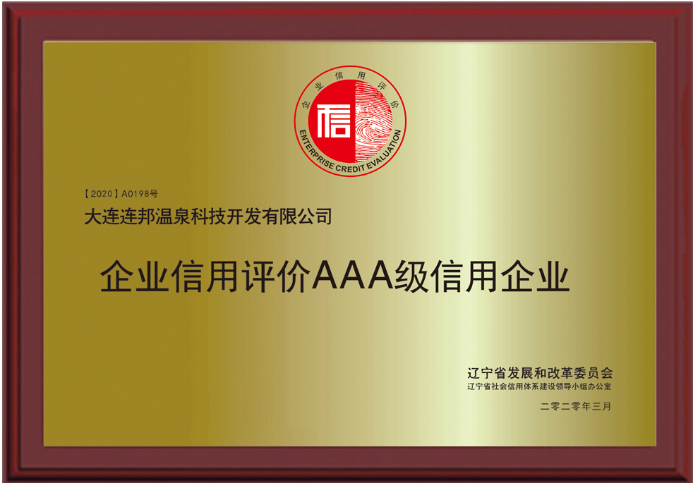 2020年3月,連邦溫泉科技通過遼寧省發(fā)改委信用等級評審,榮獲AAA級企業(yè)信用等級證書。AAA級企業(yè)在信用等級評定中是最高等級,這標(biāo)志著連邦在企業(yè)信用建設(shè)上再上一階梯,進(jìn)一步的增強(qiáng)了市場競爭力。